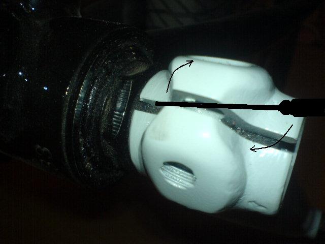 Вставляешь сюда чето (можно отвертку) и разжымаеш в туда сюда если не хочет покатайся с открученным шатуном сам отвалится, должен.