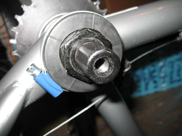 Короче у меня щель между чашкой каретки и гайкой, которая подшипник держит где то 3 милиметра. Туда дерьмо всякое тока так летит... Вобщем способ её закрыть: Мне понадобилось: - червячный хомут - 2 шт. - кусок камеры - 10 см. Разбираю систему (снимаю левый шатун, вынимаю ось со звездой и правым шатуном) Натягиваю кусок камеры шириной 2,5 см на правую сторону каретки, сверху ещё один Затягиваю всё это дело хомутом. Вставляю ось и всё остальное, закручиваю гайку слева. С левой стороны так же одеваю куски камеры, затягваю хомутом. Одеваю шатун. Вроде всё... Выглядит это вот так: |