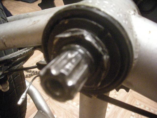 2)Откручиваеш с оси гайку и сиопорную шайбу с поперечными насечками с помошью отвертки и молотка. Вытаскиваеш подшипник