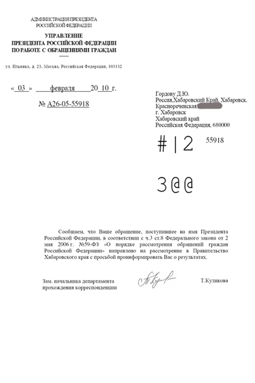 Пришло письмо с прикрепленным PDF документом. Содержание PDF: Адреса, от кого и куча лишней информации которая есть на изображении. Смое главное: Сообщаем, что ваше обращение, поступившее на имя Президента Российской Федерации, в соответствии с Ч.3 СТ.8 федерального закона от 2 мая 2006 года №59 Ф3 "О порядке рассмотрения обращений граждан Российской федерации" направленно на рассмотрение в правительство Хабаровского края с просьбой проинформировать вас о результатах. Зам начальника департамента прохождения корреспонденции Т. Куликова.