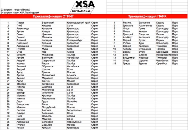 23 апреля - стрит (Плаза), 24 апреля парк- XSA Training park